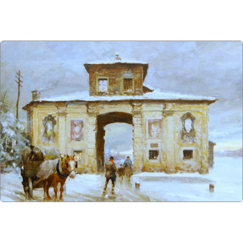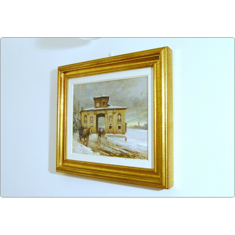 Oil on wood, pleasant winter scene, lively and colourful painting, work in the classical style of the artist who loved to portray popular characters and figures in their daily activities, the work is accompanied by an elegant frame