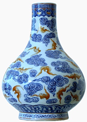 Rare porcelain vase with bats and clouds decoration, Qing dynasty, Guangxu period mark (1875-1908) elegantly decorated in blue and iron red, with gold details, underglaze decorations