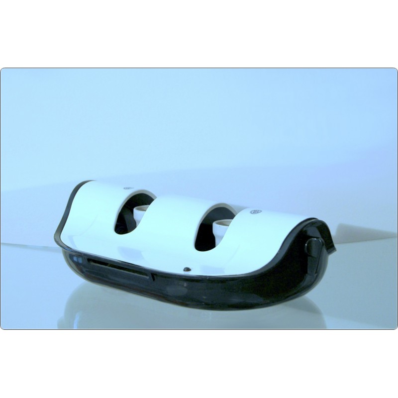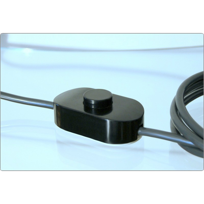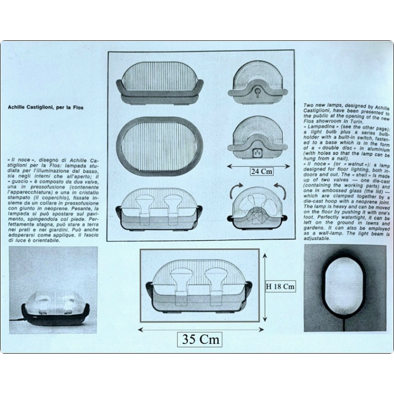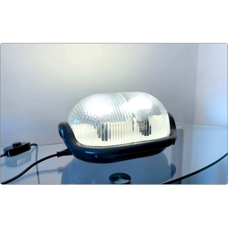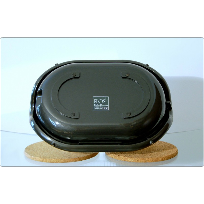 A characteristic feature is the suspension of the lamp holders, positioned on a mobile axis adjustable via an external knob, the angle of the lamps is adjustable and the light can be directed