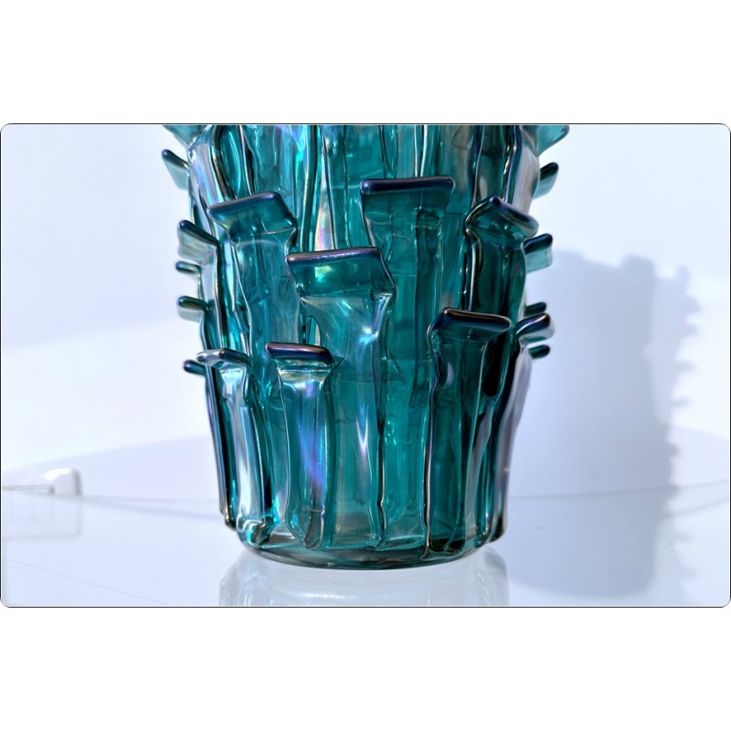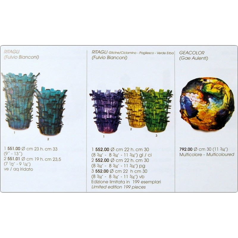 I RITAGLI utilizzano una tecnica vetraria ideata da Fulvio Bianconi, la più innovativa ed evocativa del Novecento, piccole strisce di vetro rettangolari applicate una sopra l'altra su una base troncoconica soffiata e lavorata a mano