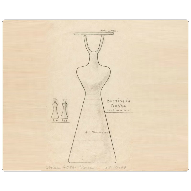 Nel 1950 Gio Ponti disegna per Venini queste bottiglie ispirandosi alle donne dipinte da Massimo Campigli, l'architetto milanese ha così modo di mettere a punto una sintesi tra arte e artigianato grazie alla collaborazione con la storica fornace di Murano