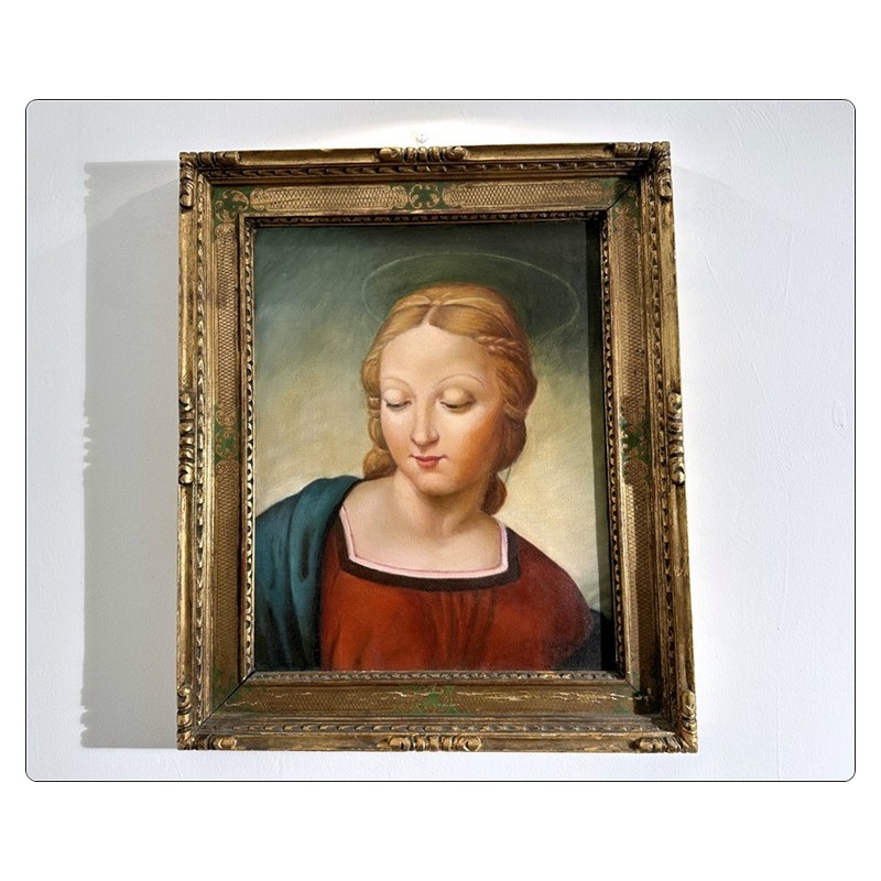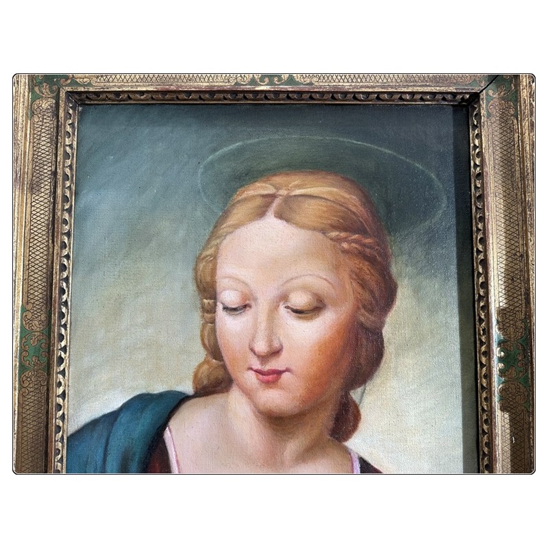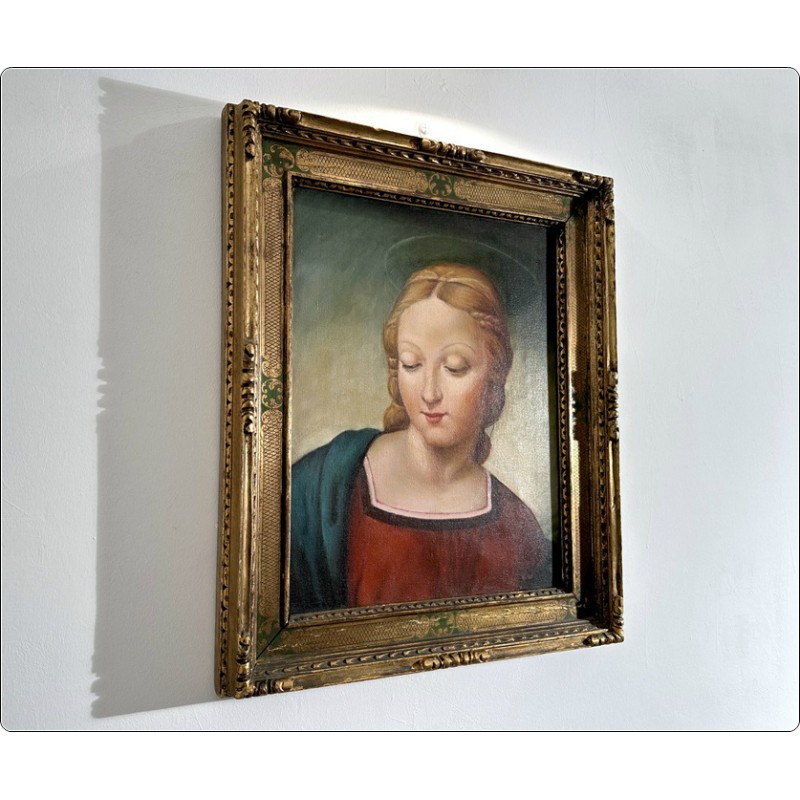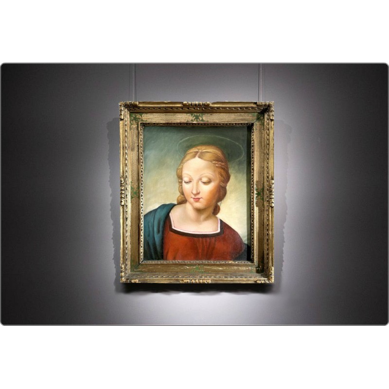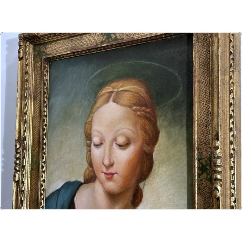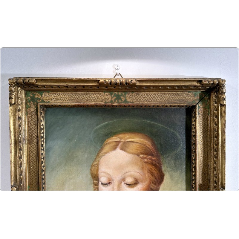 Raffinata esecuzione con tecnica ad olio su tela, dipinto raffigurante una bellissima Madonna del Cardellino, ottima resa pittorica nelle sfumature dai colori delicati