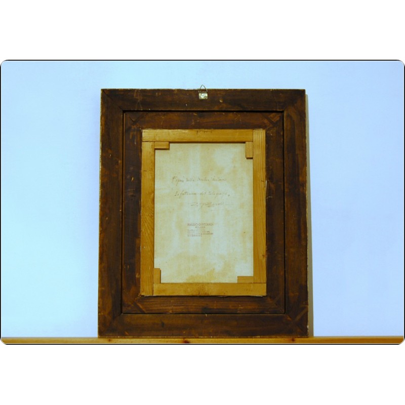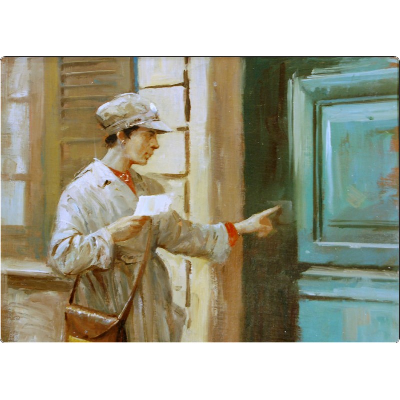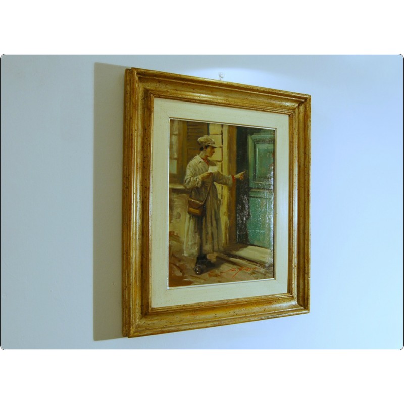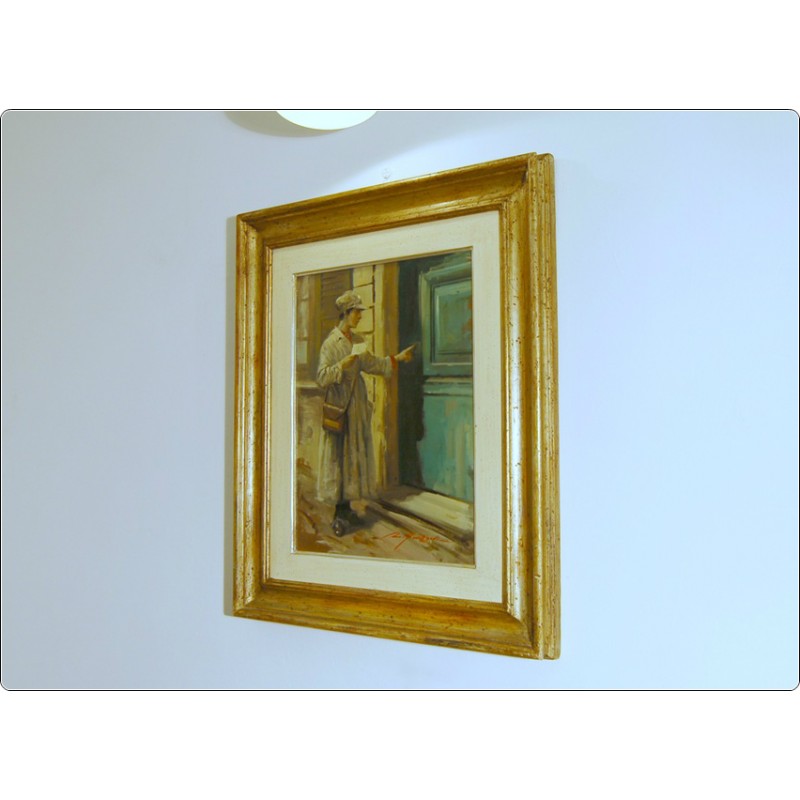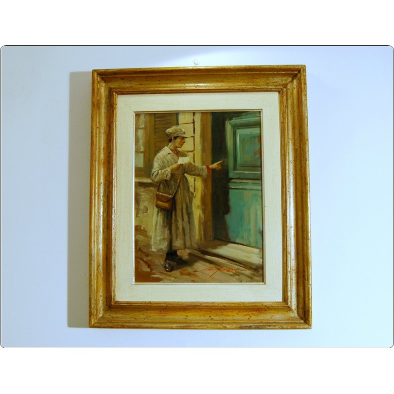Piacevole scena raffigurante una postina che consegna la posta, dipinto vivace e colorato, opera nello stile classico dell'artista che amava ritrarre personaggi e figure popolari nelle loro attività quotidiane, l'opera è corredata da un'elegante cornice