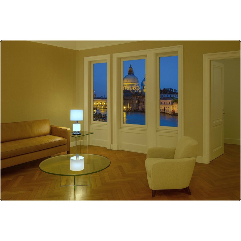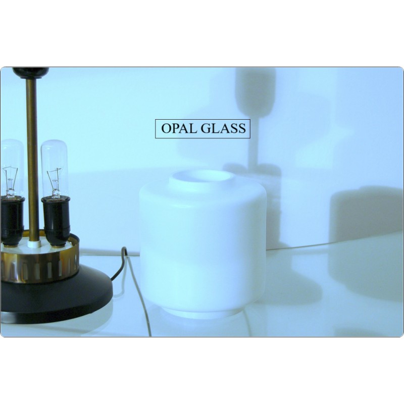 Elegante lampada da tavolo con diffusore in vetro opalino, dotata di 3 lampadine, prodotta da Stilnovo nel 1960