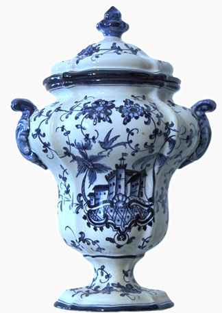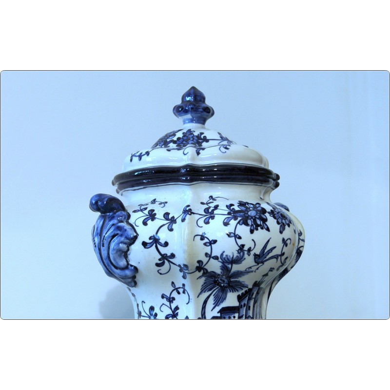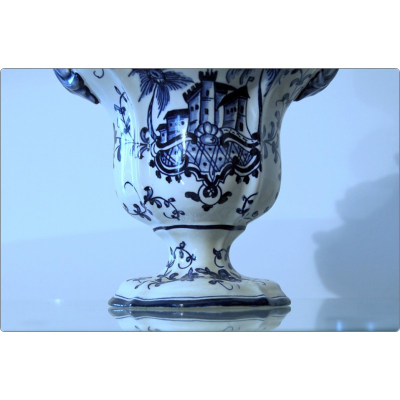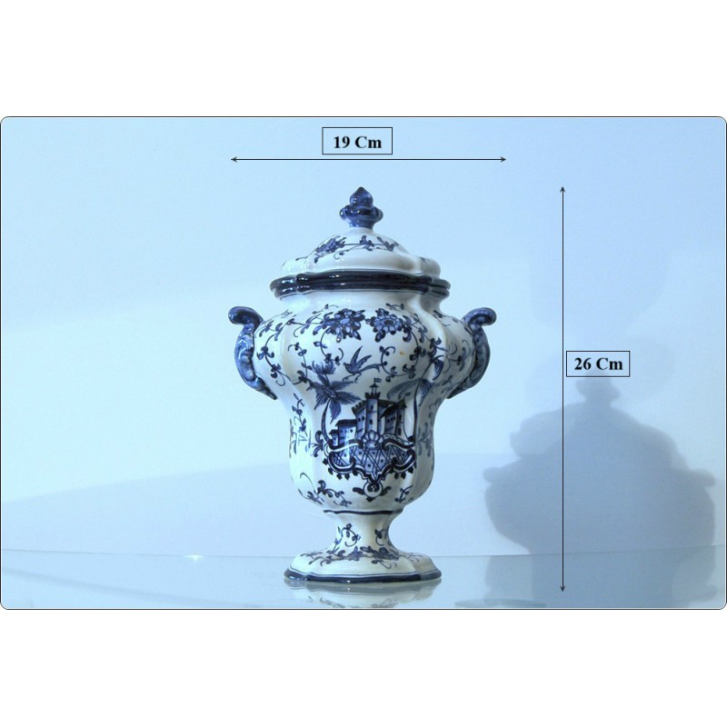 Rara potiche in maiolica del XIX secolo, sono rappresentate decorazioni floreali con il castello in monocromia blu, esemplare perfettamente conservato, marchio della manifattura sotto la base