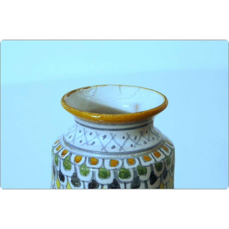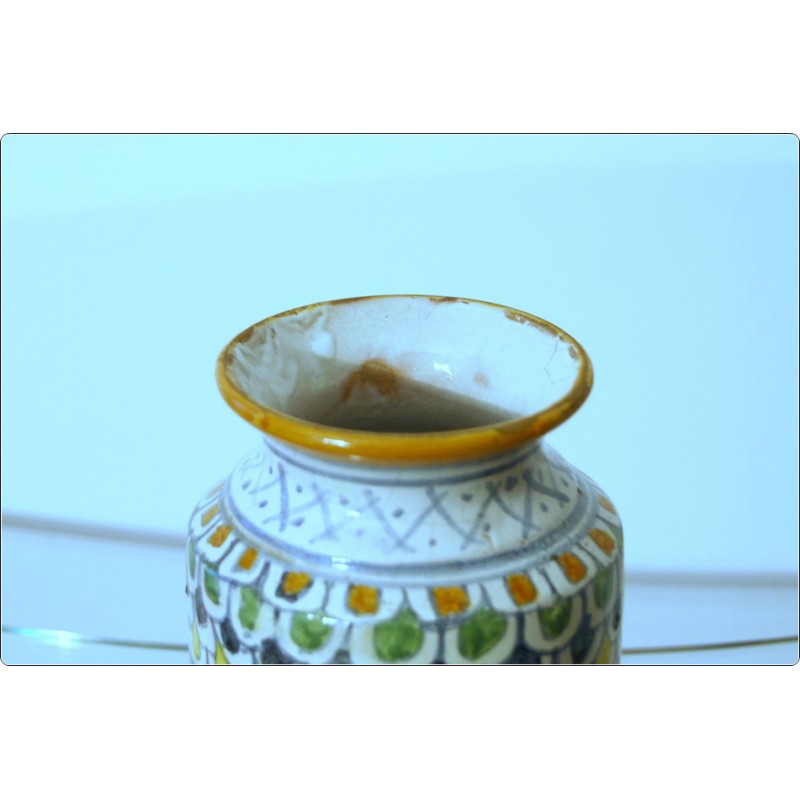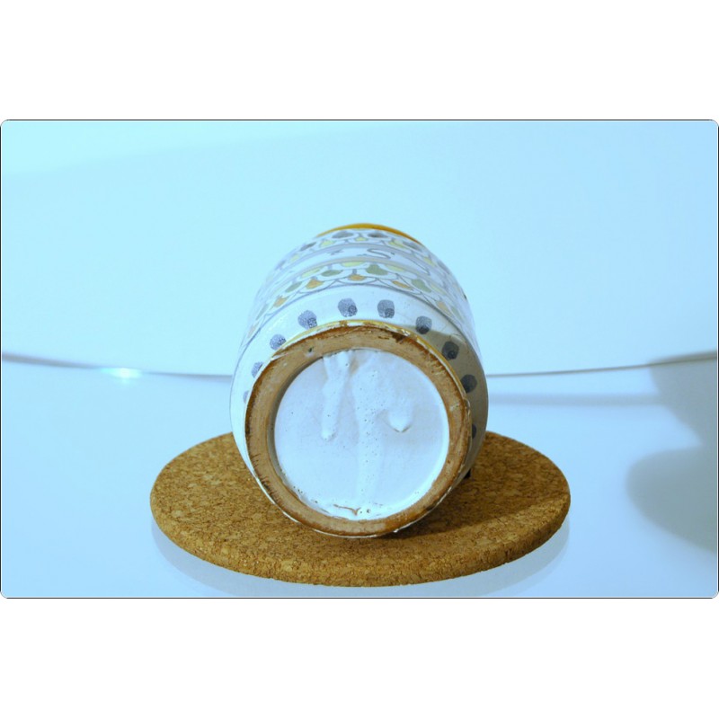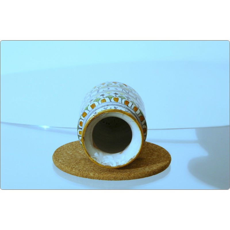 La forma cilindrica con base e collo leggermente svasati è tipica di questo contenitore, noto anche come vaso a rocchetto, vasi da farmacia utilizzati anticamente per conservare spezie, erbe o preparati medicinali