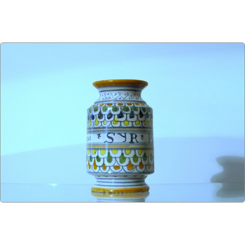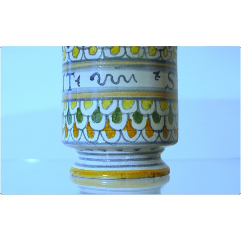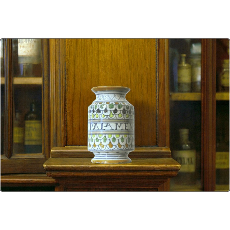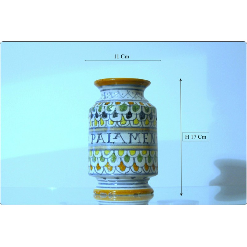 Albarello in maiolica policroma del XIX secolo, presenta decorazioni dipinte a mano con la scritta "PALAMEN" in manganese nero